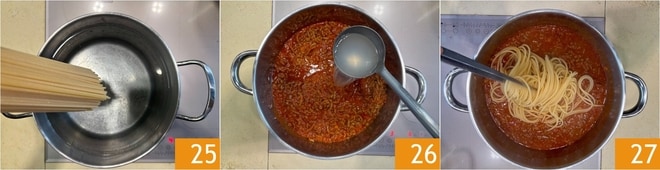 Kochen Sie nun die Spaghettoni al dente in gesalzenem, kochendem Wasser 25. Verlängern Sie das fertige Ragout mit einer Kelle Kochwasser 26. Lassen Sie hier die Spaghettoni abtropfen 27 und beenden Sie das Kochen.