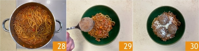 Sobald sie fertig sind 28, servieren Sie die Spaghetti mit dem Ragout, indem Sie auch die Fleischbällchen auf dem Teller hinzufügen 29. Mit geriebenem Käse bestreuen und die Spaghetti mit Ragout und Fleischbällchen sofort servieren 30!