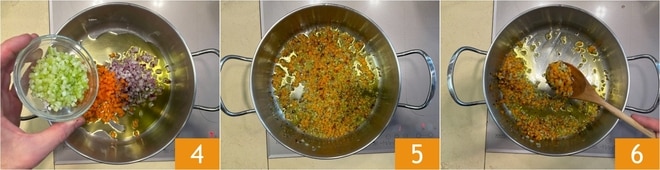 Erhitzen Sie in einem großen Topf etwas Öl, dann geben Sie das gehackte Gemüse hinzu 4 und lassen Sie es bei schwacher Hitze einige Minuten schmoren, bis es weich ist 5. Nehmen Sie den Soffritto aus dem Topf 6 und bewahren Sie ihn auf.
