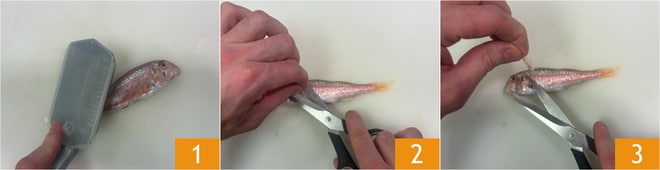 Um die Spaghetti mit Rotbarben, Mandeln und Fenchel zuzubereiten, beginnen Sie mit der Reinigung des Fisches. Zuerst schuppen Sie die Rotbarben mit dem entsprechenden Werkzeug 1 oder verwenden Sie die Rückseite eines Messers. Schneiden Sie die Seitenflossen 2 und die Rückenflosse 3 ab.