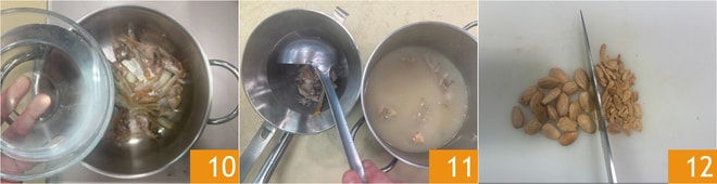 Legen Sie die Rotbarbenreste in einen Topf, bedecken Sie sie mit kaltem Wasser 10 und kochen Sie sie 20 Minuten lang oder bis das Volumen auf ¾ reduziert ist. Filtern Sie die Brühe und legen Sie sie beiseite 11. Schneiden Sie die gerösteten Mandeln in dünne Scheiben 12.