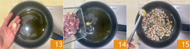 Geben Sie einen Schuss Öl in eine Pfanne, fügen Sie den Knoblauch hinzu 13 und braten Sie ihn einige Minuten an. Fügen Sie die Rotbarbenfilets hinzu 14 und braten Sie sie bei starker Hitze 2-3 Minuten lang, dann entfernen Sie den Knoblauch 15.