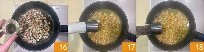 Löschen Sie mit Weißwein ab 16, würzen Sie mit Salz 17 und Pfeffer 18.