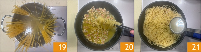 Kochen Sie die Spaghetti in kochendem Salzwasser 19, und wenn noch 2 Minuten bis zum Ende der Garzeit fehlen, geben Sie sie in die Pfanne 20, gießen Sie die Brühe hinzu und lassen Sie sie garen 21.