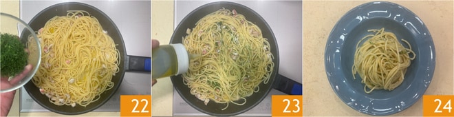 Vermischen Sie die Spaghetti, indem Sie gehackten wilden Fenchel 22 und einen Schuss Öl hinzugeben 23. Die Spaghetti anrichten 24.