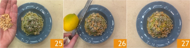 Fügen Sie die Rotbarbensauce, die gerösteten Mandeln 25, den gehackten Fenchel hinzu und vervollständigen Sie mit geriebener Zitronenschale 26. Die Spaghetti mit Rotbarben, Mandeln und Fenchel sind bereit zum Servieren 27.