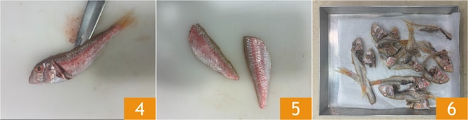 Mit einer Schere schneiden Sie den Bauch des Fisches bis zum Kopf ein und spülen ihn unter fließendem Wasser aus, um die Innereien zu entfernen. Machen Sie einen diagonalen Schnitt, kurz nach den Kiemen, der vom Rücken ausgeht und sich mit dem zuvor am Bauch gemachten Schnitt verbindet. Schneiden Sie den Schwanz und den Rücken entlang der Wirbelsäule 4 und entnehmen Sie die Filets 5. Verfahren Sie auf die gleiche Weise mit allen Rotbarben. Legen Sie die Köpfe und Gräten auf ein mit Backpapier ausgelegtes Blech und lassen Sie sie im Ofen bei 180°C für 15-20 Minuten trocknen 6.