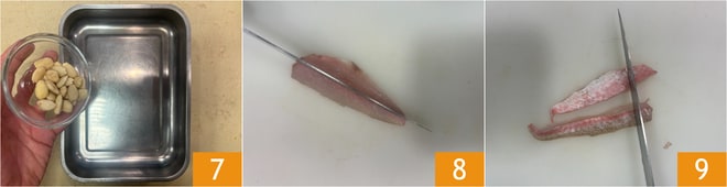 Zusammen mit den Rotbarbenresten legen Sie auch die Mandeln in den Ofen 7 und nehmen Sie sie heraus, sobald sie goldbraun werden. Inzwischen schneiden Sie die Rotbarbenfilets zuerst in der Mitte 8 und dann in ca. 1 cm große Würfel 9. Beiseite legen.