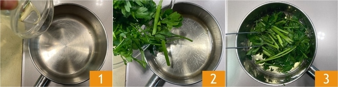 Um die Spaghetti mit Venusmuscheln, Kürbissauce und Mandarinenmostarda zuzubereiten, beginnen Sie mit der Herstellung des Petersilienöls: Gießen Sie das Pflanzenöl in einen kleinen Topf 1 und erhitzen Sie es auf 100°, dann fügen Sie die zuvor gewaschene und getrocknete Petersilie hinzu 2. Blanchieren Sie die Petersilie für einige Minuten und rühren Sie dabei ständig um 3.