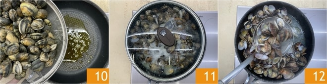 Sobald der Knoblauch aufschwimmt, fügen Sie die Venusmuscheln hinzu 10, decken Sie mit einem Deckel ab (am besten aus Glas) 11 und kochen Sie auf mittlerer Hitze, bis sie sich alle geöffnet haben. Nehmen Sie die Venusmuscheln dann mit einem Schaumlöffel heraus 12, um sie von ihrem Kochsud zu trennen.