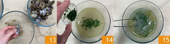 Schälen Sie die Venusmuscheln und legen Sie sie zur Seite in eine Schüssel 13. Gießen Sie den Kochsud in eine andere Schüssel, wobei Sie darauf achten, eventuelle Rückstände in der Pfanne zu belassen, dann fügen Sie die gehackte Petersilie hinzu 14, mischen Sie und stellen Sie sie beiseite 15.