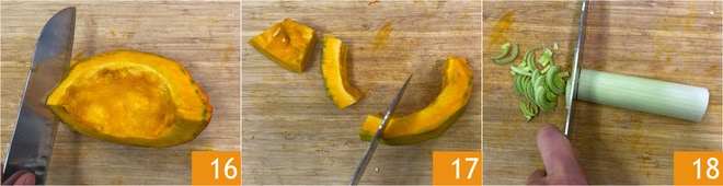 Machen Sie mit der Kürbissauce weiter: Schälen Sie den Kürbis 16 und schneiden Sie 200 g Fruchtfleisch in Würfel 17, dann putzen Sie den Lauch und schneiden Sie den weißen Teil dünn 18.
