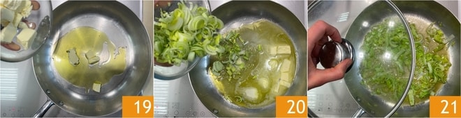 In einer Pfanne schmelzen Sie sanft die Butter mit dem Öl 19, dann fügen Sie den Lauch hinzu 20. Reduzieren Sie die Hitze, decken Sie mit einem Deckel ab und dünsten Sie den Lauch sanft für einige Minuten 21.