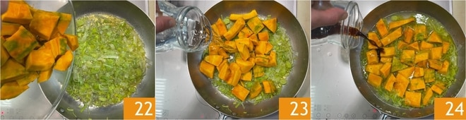 Fügen Sie nun den Kürbis hinzu 22, dann gießen Sie das Wasser 23 und die Sojasauce 24 dazu. Decken Sie mit einem Deckel ab und kochen Sie für 20 Minuten.