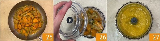 Wenn der Kürbis gekocht ist, sollte das Gewicht des Inhalts der Pfanne 450 g betragen 25. Geben Sie alles in einen Mixer 26 und mixen Sie, um eine glatte und homogene Konsistenz zu erhalten 27. Würzen Sie die Kürbissauce mit Salz und stellen Sie sie beiseite.