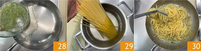Bringen Sie einen Topf mit gesalzenem Wasser zum Kochen und gießen Sie einen Teil des Kochsuds der Venusmuscheln in eine Pfanne 28. In der Zwischenzeit erhitzen Sie ungesalzenes Wasser in einem anderen kleinen Topf. Kochen Sie die Spaghetti für 5 Minuten 29, dann geben Sie sie in die Pfanne 30.