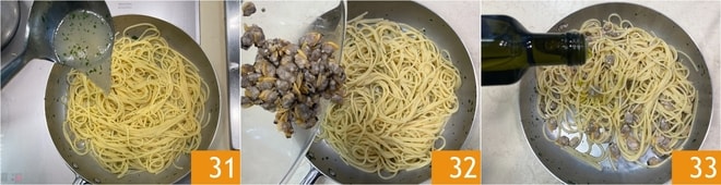 Kochen Sie die Spaghetti weiter, indem Sie den Kochsud der Venusmuscheln abwechselnd mit dem ungesalzenen Wasser, jeweils einen Schöpflöffel, hinzufügen 31. Probieren Sie gelegentlich, um die Würzigkeit zu überprüfen und sich entsprechend zu entscheiden, welche Flüssigkeit Sie hinzufügen. Beenden Sie das Risottare der Pasta, indem Sie auch einen Schuss Öl hinzufügen. Wenn Sie eine schöne Creme erhalten haben, nehmen Sie die Spaghetti vom Herd und fügen Sie die geschälten Venusmuscheln hinzu 32. Fügen Sie noch einen Schöpflöffel Flüssigkeit und einen Schuss Öl hinzu 33 und schwenken Sie alles erneut, um es zu vermischen, immer außerhalb der Hitze.