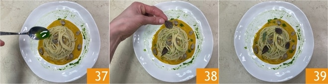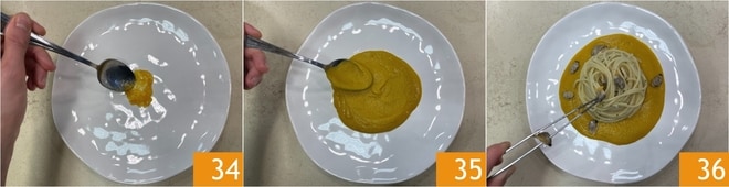 Sie sind bereit zum Anrichten: Verteilen Sie die Mandarinenmostarda auf dem Tellerboden 34, dann bedecken Sie mit der Kürbissauce 35 und legen Sie darauf ein Nest aus Spaghetti mit Venusmuscheln 36.