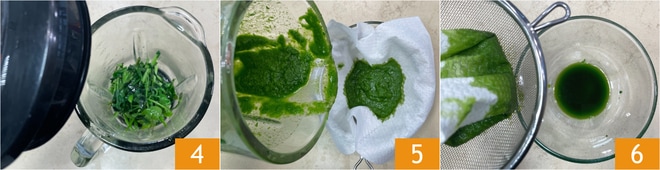 Mixen Sie die Mischung für 30 Sekunden 4, dann gießen Sie das erhaltene Püree in ein mit Küchenpapier ausgelegtes Sieb, das Sie über eine Schüssel gelegt haben 5. Lassen Sie es im Kühlschrank abtropfen, auch über Nacht: So wird sich das Vegetationswasser am Boden der Schüssel absetzen, während das Petersilienöl Tropfen für Tropfen obenauf schwimmt 6. Am Ende des Rezepts benötigen Sie sowohl das Öl als auch die Petersilienpaste, die im Küchenpapier zurückbleibt.