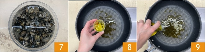 Wenn das Petersilienöl fast fertig ist, können Sie sich den Venusmuscheln widmen: Lassen Sie sie eine Stunde lang in einem Liter Wasser und 25 g Salz einweichen 7. Nach dieser Zeit schütteln Sie sie in einer Schüssel und überprüfen, ob keine Sandreste vorhanden sind; falls doch, wiederholen Sie das Einweichen. Nach dieser Zeit beginnen Sie, den gehackten Knoblauch mit einem Schuss Öl in einer Pfanne sanft zu bräunen 8, dann fügen Sie weitere 100 g Olivenöl hinzu 9.