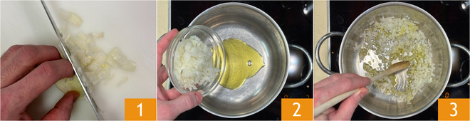 Um die Spaghetti mit Wurstbällchen und gelber Tomatensauce zuzubereiten, beginnen Sie mit der Sauce: Zwiebel fein hacken 1 und in einen Topf mit einem Schuss Öl geben 2, dann etwa zehn Minuten sanft schmoren lassen 3.