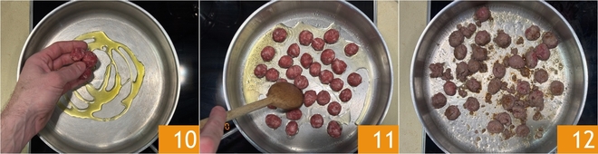 Geben Sie die Bällchen in eine Pfanne mit einem Schuss Öl 10 und braten Sie sie bei mittlerer Hitze etwa 5 Minuten lang an 11. Wenn sie gleichmäßig goldbraun sind, das Feuer ausschalten 12.