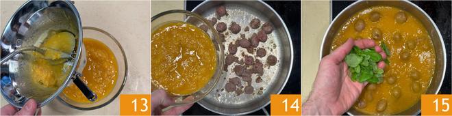 Nach der Kochzeit der Sauce passieren Sie sie durch eine Flotten Lotte, um eine glatte und samtige Sauce zu erhalten 13. Fügen Sie die Sauce zu den Bällchen hinzu 14 und duften Sie mit ein paar Basilikumblättern 15, dann vorsichtig umrühren, um sie zu vermischen.