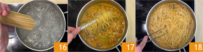 In der Zwischenzeit die Spaghetti in gesalzenem kochendem Wasser kochen 16. Die Pasta sehr al dente abgießen und in die Pfanne mit der Sauce geben 17, die Flamme anzünden und alles 2-3 Minuten schwenken, bei Bedarf etwas Kochwasser hinzufügen 18.
