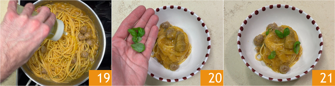Bei ausgeschaltetem Feuer mit einem Schuss Öl abschmecken 19. Anrichten und mit frischen Basilikumblättern garnieren 20. Ihre Spaghetti mit Wurstbällchen und gelber Tomatensauce sind servierbereit 21!
