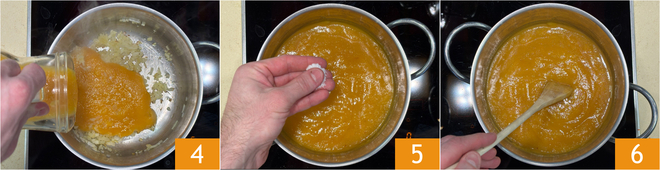 Wenn sie weich geworden ist, fügen Sie die gelbe Tomatensauce hinzu 4. Salzen 5 und bei schwacher Hitze etwa 20 Minuten kochen lassen 6.