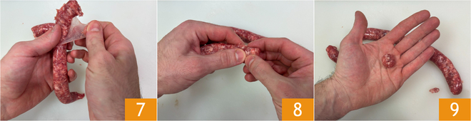 In der Zwischenzeit widmen Sie sich den Bällchen: Entfernen Sie die Pelle von der Wurst 7, dann trennen Sie mit den Händen kleine Fleischstücke ab 8 und formen kleine Bällchen 9.