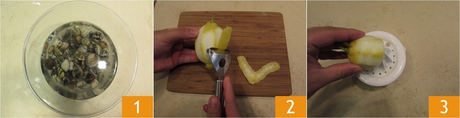 Um die Spaghetti mit Zitronenpesto und Venusmuscheln zuzubereiten, beginnen Sie mit den Letzteren: Lassen Sie sie 1-2 Stunden in reichlich Salzwasser spülen 9, indem Sie das Wasser ein paar Mal wechseln, um eventuelle Sandreste zu entfernen 1. In der Zwischenzeit kümmern Sie sich um das Zitronenpesto: Nehmen Sie die Schale der Zitrone mit einem Sparschäler ab, ohne die weiße Schicht zu entfernen 2, und pressen Sie dann den Saft aus 3.
