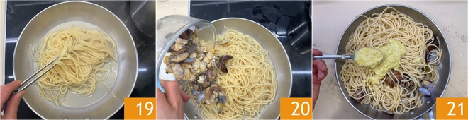 Lassen Sie hier die Spaghetti al dente abtropfen und beenden Sie das Kochen 19. Am Ende fügen Sie die Venusmuscheln 20 und das Zitronenpesto 21 hinzu.