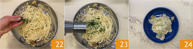 Aromatisieren Sie mit gehackter Petersilie 22 und gemahlenem Pfeffer 23. Servieren Sie Ihre Spaghetti mit Zitronenpesto und Venusmuscheln heiß 24.
