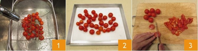 Um die Spaghettinester mit scharfer Soße zuzubereiten, waschen Sie die Tomaten 1. Trocknen Sie sie ab 2 und schneiden Sie sie in Viertel 3. Legen Sie sie beiseite.
