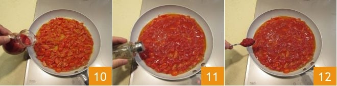 Jetzt fügen Sie auch die Passata hinzu 10 und würzen mit Salz und Pfeffer 11. Geben Sie auch das Tomatenmark dazu 12.