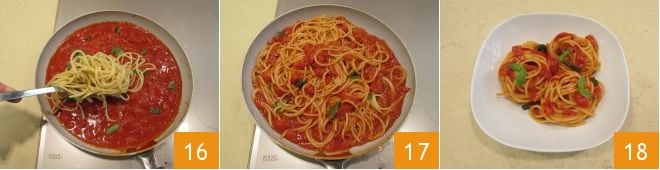 Eine Minute vor Ende der Garzeit gießen Sie die Pasta ab und geben sie in die Pfanne mit der Soße 16. Vermengen Sie die Zutaten gut, damit die Soße gleichmäßig mit den Spaghetti vermischt wird 17. Schließlich richten Sie die Spaghetti mit der scharfen Soße an, indem Sie sie zu drei kleinen Nestern auf dem Teller formen: Nehmen Sie etwas Pasta mit der Gabel auf. Während Sie sie auf die Gabel wickeln, stützen Sie diese auf einen Löffel, damit die Pasta nicht herunterfällt. Legen Sie die Spaghettinester vorsichtig auf den Teller und garnieren Sie nach Belieben mit einigen gewaschenen und getrockneten Basilikumblättern. Ihre Spaghettinester mit scharfer Soße sind bereit, genossen zu werden 18!