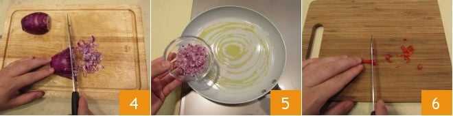 Dann hacken Sie die Zwiebel fein 4 und lassen Sie sie in einer Antihaftpfanne mit einem Schuss Öl anschwitzen 5. Entfernen Sie dann die Kerne aus der Chilischote und schneiden Sie sie in dünne Streifen 6.