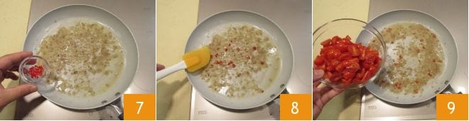 Fügen Sie die Chilischote in die Pfanne hinzu 7 und verteilen Sie sie gleichmäßig mit einem Spatel 8. An diesem Punkt fügen Sie auch die Tomaten hinzu 9. Erhitzen Sie alles bei mittlerer Hitze für 7-8 Minuten.