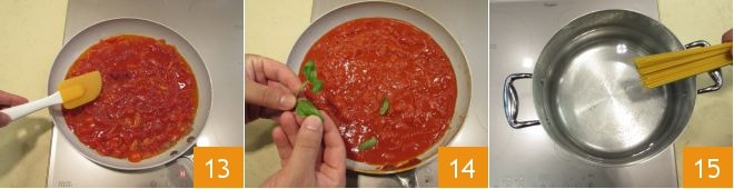 Vermengen Sie die Zutaten gut mit einem Spatel 13 und lassen Sie alles weitere 30 Minuten bei sehr niedriger Hitze köcheln. Am Ende der Garzeit fügen Sie grob gehacktes Basilikum zur Aromatisierung hinzu 14. Kochen Sie die Spaghetti in reichlich gesalzenem Wasser 15.