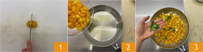 Um das Spaghettone mit gelben Datteltomaten zuzubereiten, schneiden Sie die zuvor gewaschenen Datteltomaten in 4 Teile 1. Erwärmen Sie dann in einer großen Pfanne einen Schuss Öl, fügen Sie die Datteltomaten hinzu 2 und braten Sie sie bei ziemlich hoher Hitze unter häufigem Wenden an. Würzen Sie mit einer Prise Salz und den von Hand zerkleinerten Basilikumblättern 3.