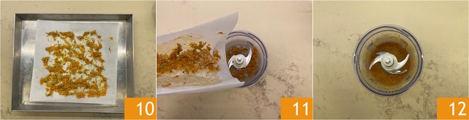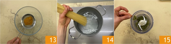Sieben Sie, um ein sehr feines Pulver zu erhalten 13. Nun können Sie die Pasta im gesalzenen kochenden Wasser 14 Minuten kochen 14. In der Zwischenzeit bereiten Sie das andere Pulver vor, das auf dem Endgericht verteilt wird: Geben Sie die getrockneten Oreganoblätter, die von den Zweigen abgelöst wurden, in den Mixer 15.