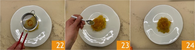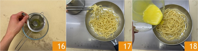 Sieben Sie auch diese Mischung und sammeln Sie sie in einer kleinen Schüssel 16. Seihen Sie die Spaghettoni ab und geben Sie sie in die gleiche Pfanne, in der Sie die Tomätchen gekocht haben 17. Geben Sie die Datteltomatensauce hinzu 18.