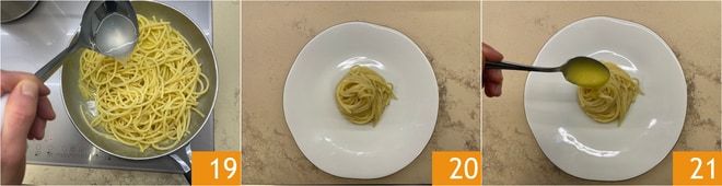 Setzen Sie das Garen der Pasta mit der Sauce für weitere 2-3 Minuten fort, wobei Sie bei Bedarf Kochwasser hinzufügen, um eine schöne Creme zu erzeugen 19. Richten Sie die Pasta als Nest 20 auf jedem Teller an und bedecken Sie sie mit reichlich Creme 21.