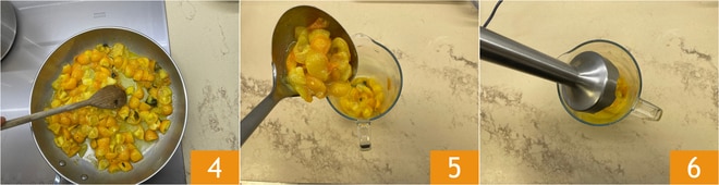 Bedecken Sie die Tomaten mit Wasser und lassen Sie sie etwa 20 Minuten köcheln; drücken Sie sie gelegentlich mit dem Kochlöffel 4. Sobald sie gar sind, pürieren Sie sie mit einem Stabmixer 5 6.