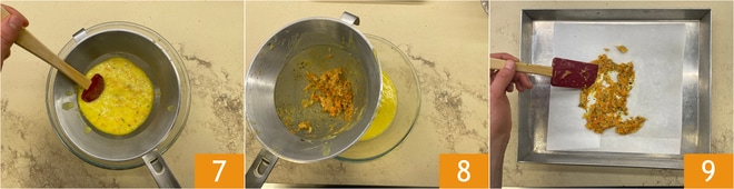 Um die erhaltene Sauce glatter zu machen, streichen Sie sie durch ein Sieb 7. Die übrig gebliebenen Tomatenschalen werden nicht weggeworfen 8: Sie können auf einem mit Backpapier ausgelegten Backblech verteilt werden 9.