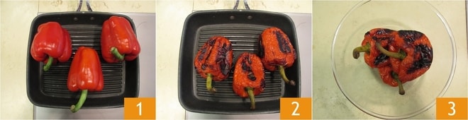 Um die Spaghettoni mit Paprikacreme und Kabeljau zuzubereiten, waschen Sie zuerst die Paprika gut und trocknen Sie sie ab. Erhitzen Sie einen Grill auf dem Herd, dann legen Sie die Paprika darauf 1. Grillen Sie sie etwa 40 Minuten lang, wobei Sie sie oft wenden, damit sie nicht anbrennen. Wenn sie gar sind, geben Sie sie in eine Schüssel 3.