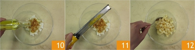 Fügen Sie einen Schuss Öl 10 und die abgeriebene Schale einer Zitrone hinzu 11. Mischen Sie gut, um alle Aromen zu vereinheitlichen 12.