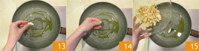 Erhitzen Sie einen Schuss Öl in einer Pfanne, fügen Sie den Knoblauch 13 und die zerbrochenen Lorbeerblätter hinzu. Lassen Sie es erhitzen und fügen Sie den Kabeljau hinzu 15.