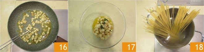 Braten Sie ihn sehr kurz an, entfernen Sie dann den Knoblauch 16 und geben Sie ihn in eine Schüssel 17. Kochen Sie die Spaghettoni in reichlich kochendem Wasser, gesalzen nach Geschmack 18.